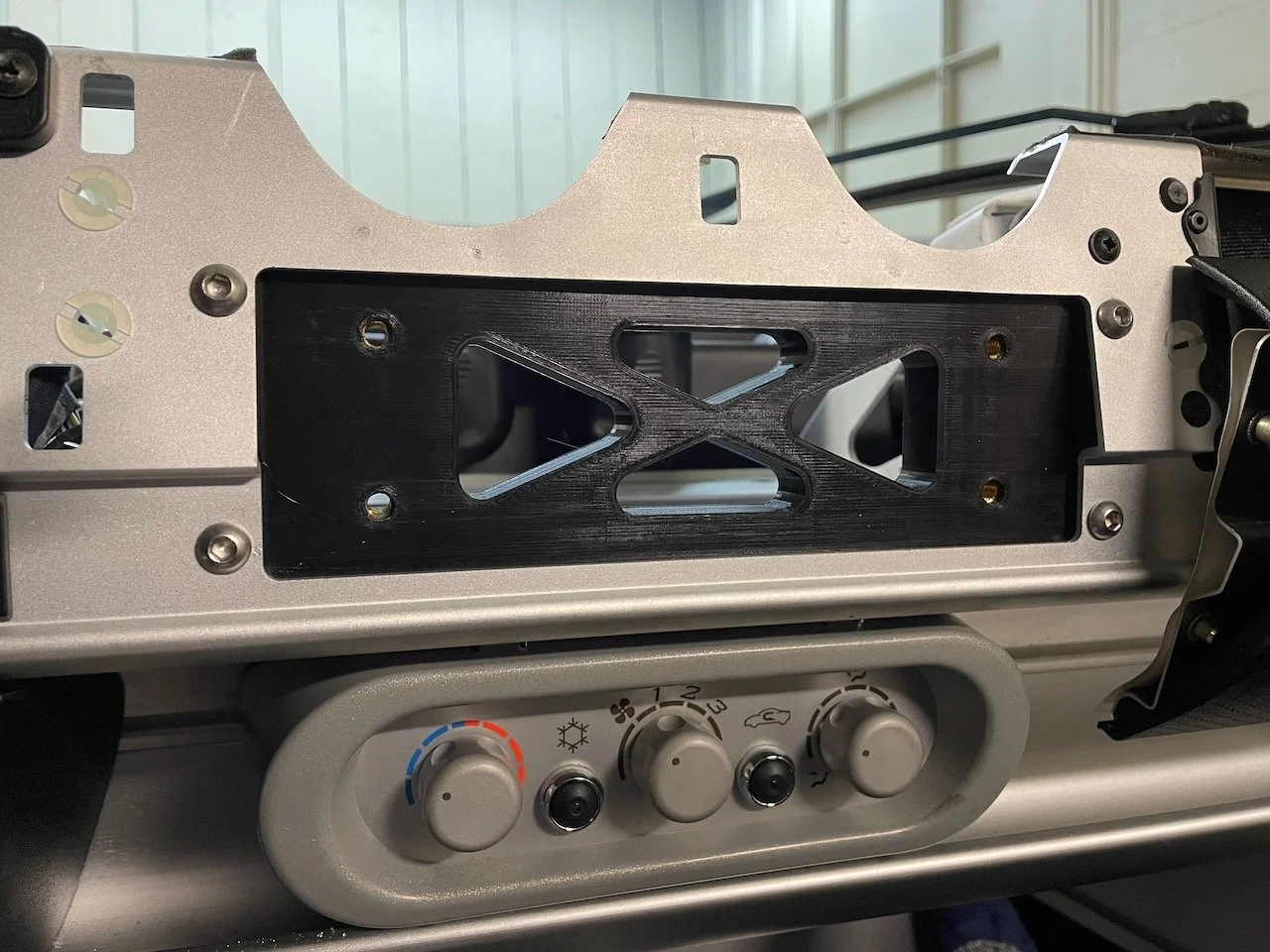 I was able to use the area on the dash that previously held a stereo as a mounting point. I designed and 3D printed a two piece mount that slotted right into the stereo cavity and extended out to the right position. To secure it to the dash I printed a backing plate that conformed to the dash profile that the mount could butt up against. In all printed pieces I used brass heat-press inserts to add threaded holes where they were needed.