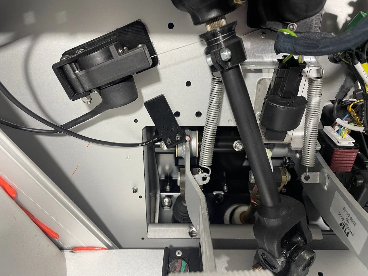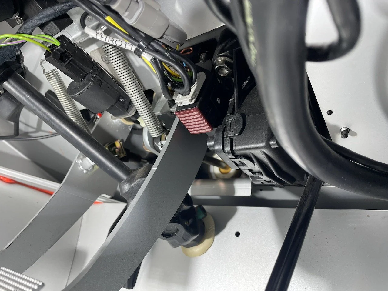 One comment about the brake pedal string pot: This should ideally be installed such that depressing the pedal results in the string pot retracting, so that if the sensor seizes it will not restrict brake application. However, this could not be done within the tight area above the pedals without a complex pulley arrangement. Instead, the end of the potentiometer’s string is fastened with a small plastic zip-tie. One that is large enough to hold it in place, but small enough that it would break if necessary with the nominal force applied to the brake pedal under use.